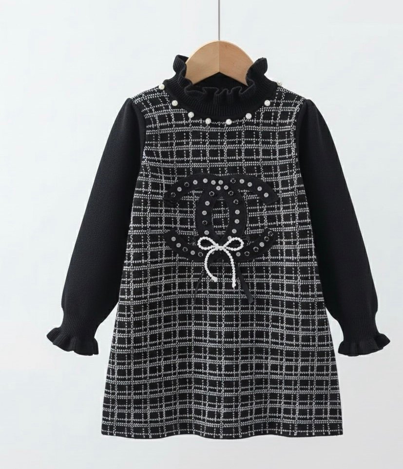 Girl’s Faux-Layered Tweed Knit Dress with Sleeves