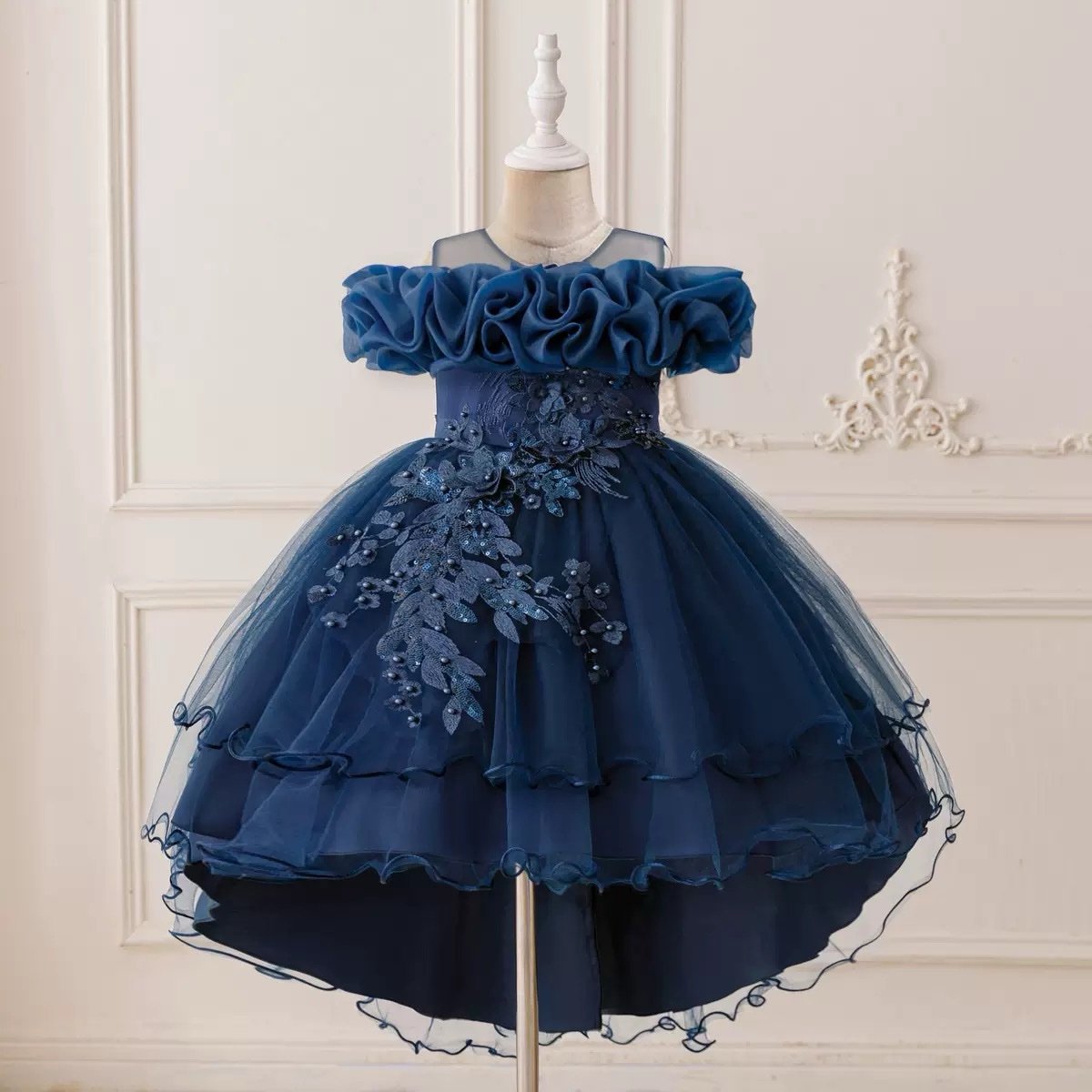 Girls Navy Blue Pageant/Party Dress: Tiered Tulle Gown with 3D Flowers