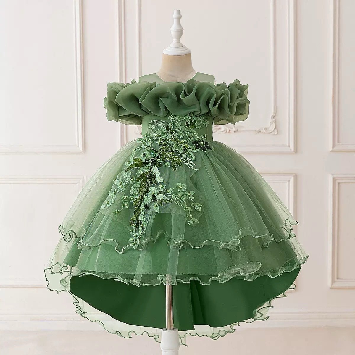 Toddler Emerald Green Formal Dress, Off-Shoulder Ruffle, Sequin Lace